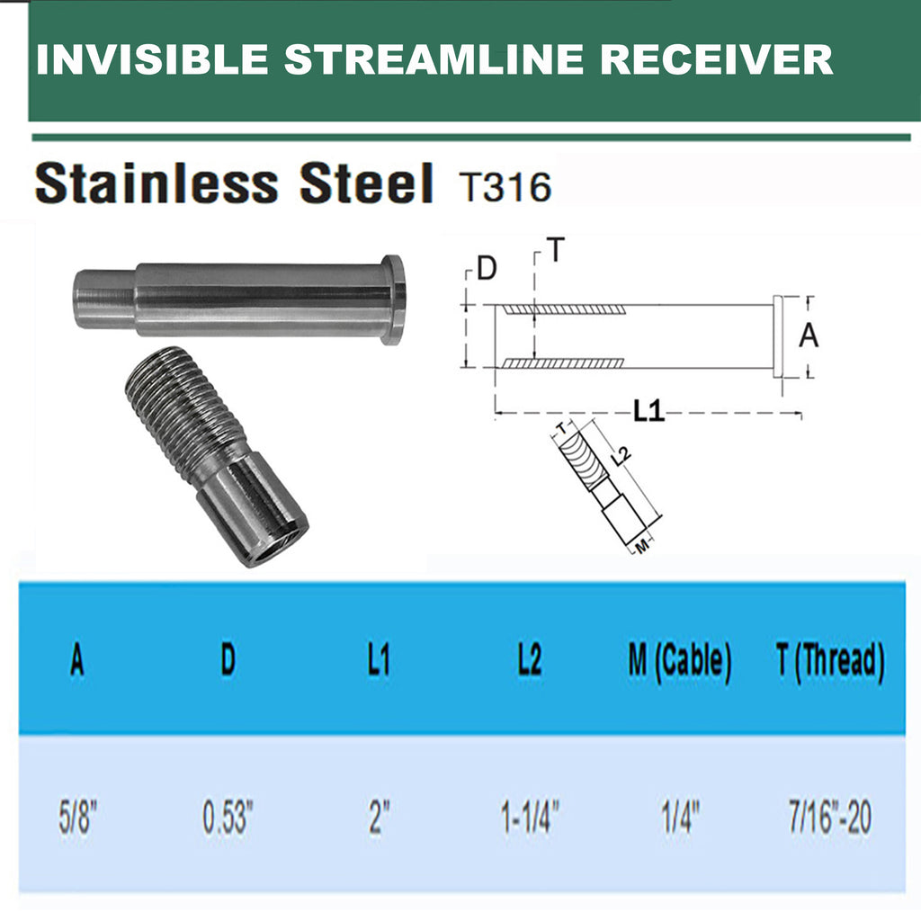 - 2 Pc Stainless Steel T316 UNF 7/16'' Streamline Receiver And Stud