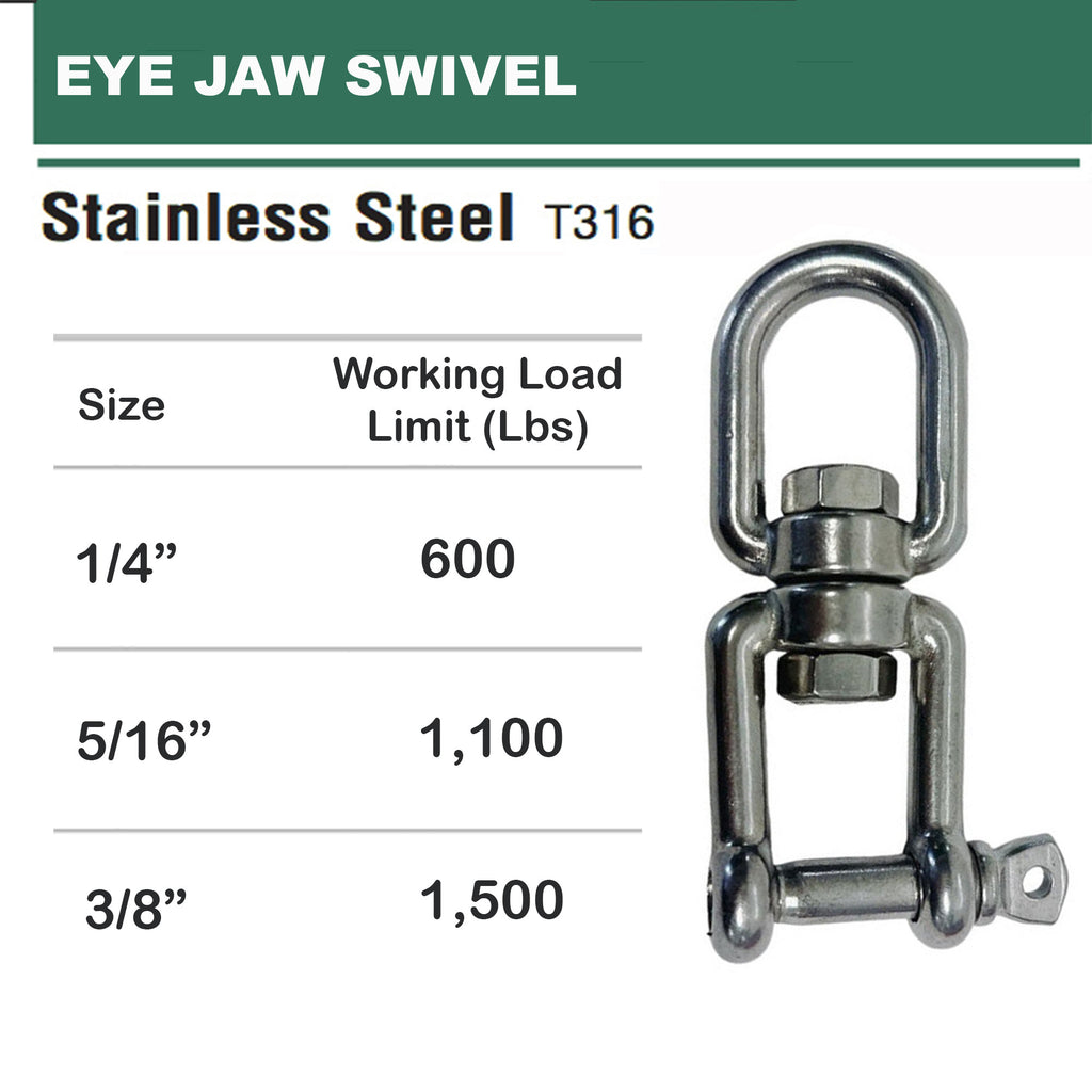 - Stainless Steel 316 EYE JAW Swivel 1/4", 5/16", 3/8" Swivel Marine Mooring