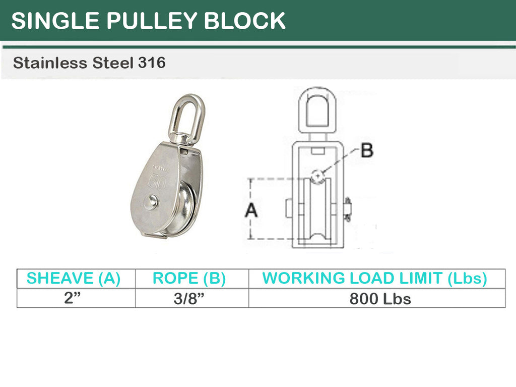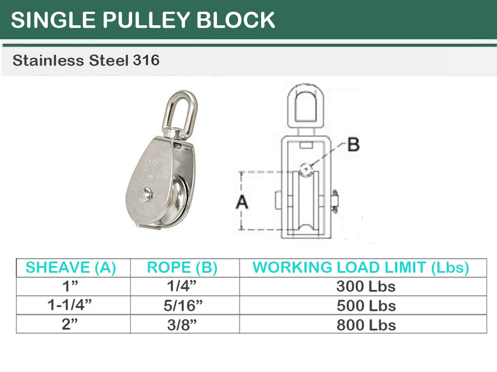 - Stainless Steel Single Pulley Swivel Eye Hoist 1", 1-1/4", 2"