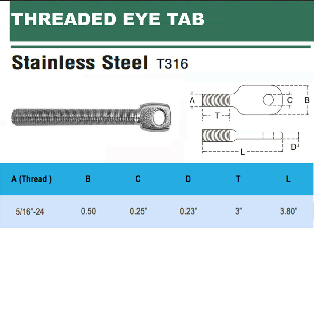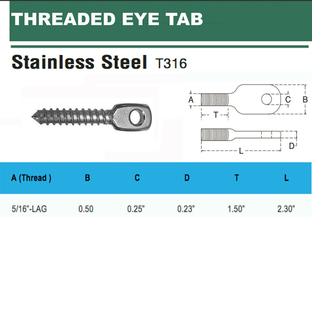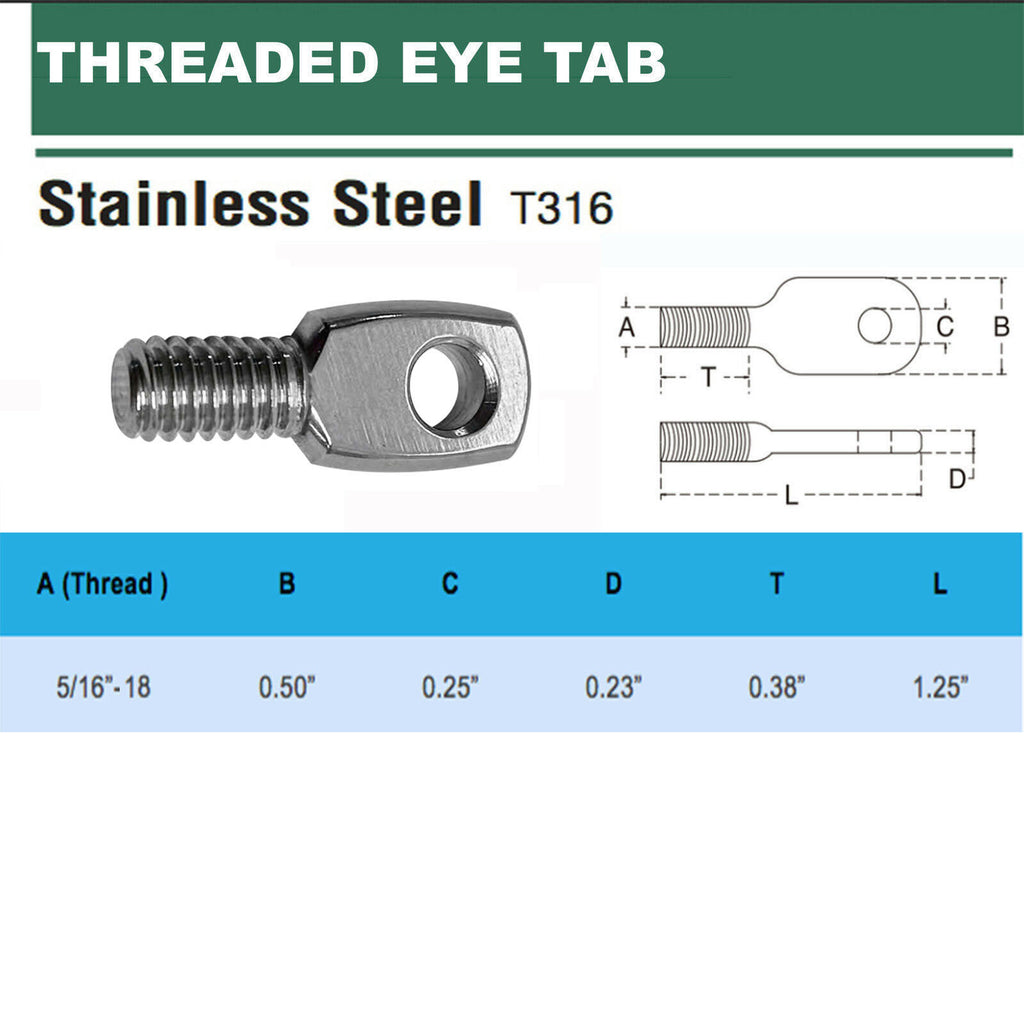 - T316 Stainless Steel Threaded Eye Tab 5/16"-18 Thread, 5/16"-24 Thread, 5/16"-Lag Thread Size